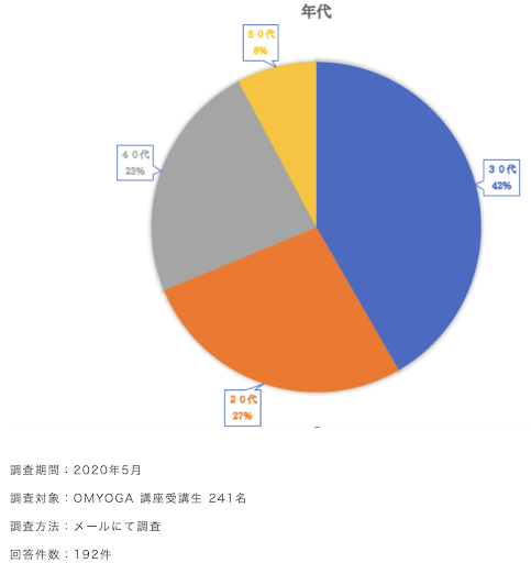結論からお伝えすると、40代でも活躍しているヨガインストラクターはたくさんいます。ヨガインストラクター養成講座参加者の年代を調査した、次のデータをご覧ください。