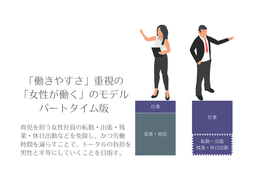 ただし、残念ながらこうした形態では、転勤・出張・残業・休日出勤といった働き方ができない分、キャリア形成の機会が与えられづらかったり、そもそも仕事の時間が短い分、責任ある仕事を任せてもらえないなど、女性が社会でキャリアを形成して「活躍する」姿とは程遠い労働モデルでした。