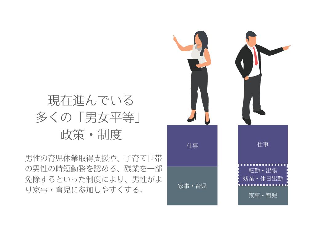 一見すると、性役割に囚われず、男女が平等に社会参画するための一歩を踏み出しているように見えるこうした政策・制度ですが、実は裏側を見ると一概にそうとは言えません。