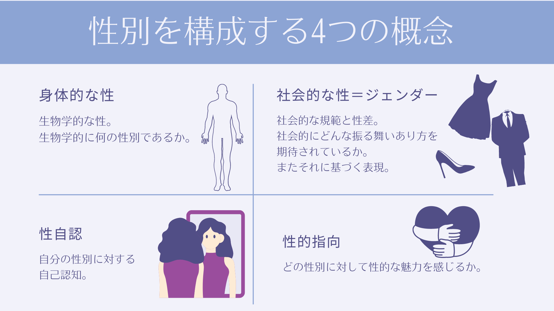 私たちが日常のなかで「性別」を捉える際には、身体的な性、社会的な性(=ジェンダー)、性自認、性的指向という4つの観点から性別を認識しているということ。
