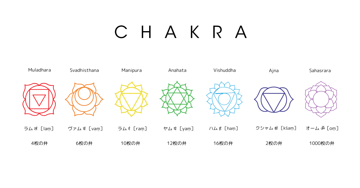 たとえば、ルートチャクラには四弁の蓮、ハートチャクラには12弁の蓮が関連付けられ、ビージャマントラ『Lam』や『Yam』がそれぞれ対応する音として使われました。
