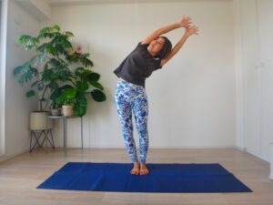 いまいちわからない、あまり変わらない場合には、まず両腕はあげずに練習をしてみる、もしくは上半身を横に倒す前に腕を上げても力まないように力を抜く練習をしてみましょう。吐く息のタイミングで体は緩みやすくなります。吐く息を長めに意識してやってみてくださいね。