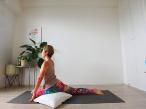 用意してほしいものはどのおうちにもあるクッションです。お尻がマットから離れてしまうかたは、その隙間を埋めるためにクッションを挟むようにしてあげてください。そして吐く息ごとにそのクッションを押しつぶすような意識をもって深められると良いでしょう。こうすることで今硬くなっているお尻や股関節もじわじわほぐれやすくなっていきます。