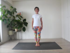 1.マットの真ん中でタダーアーサナになります。まわりにぶつかって危ないものがないか確認してください。