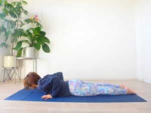 1.うつ伏せの状態から始めます。両手は胸の横に置いておきましょう。