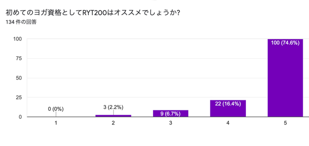 「はじめてのヨガ資格としてRYT 200はオススメでしょうか」という質問に対し、134名のうち、91%が「オススメする」と答えています。
